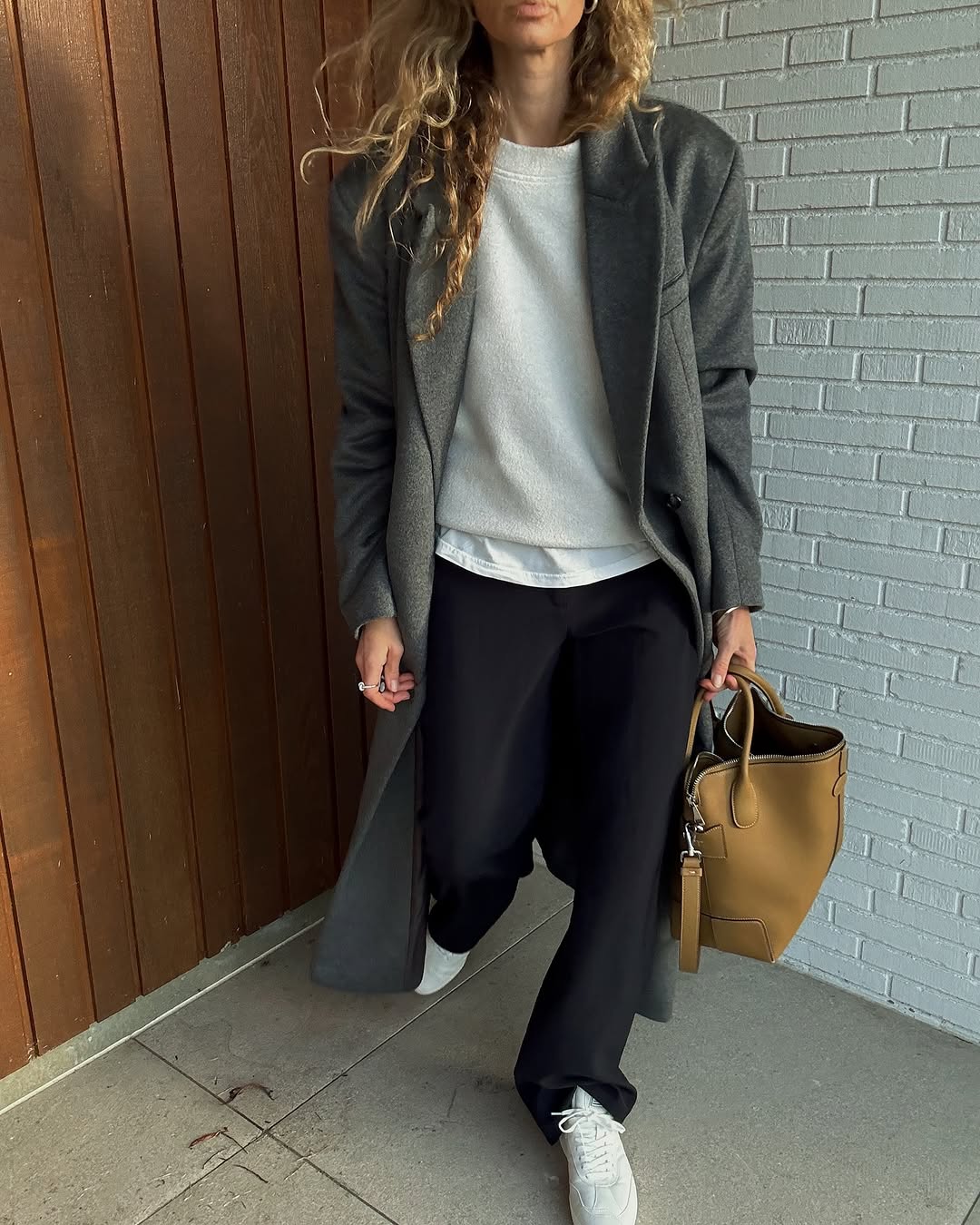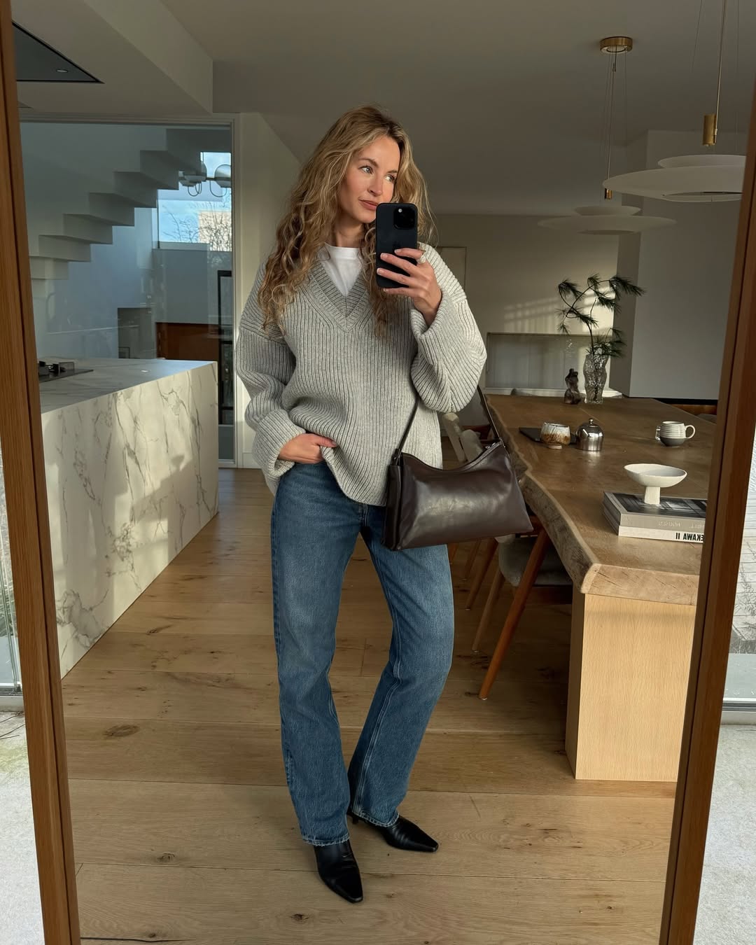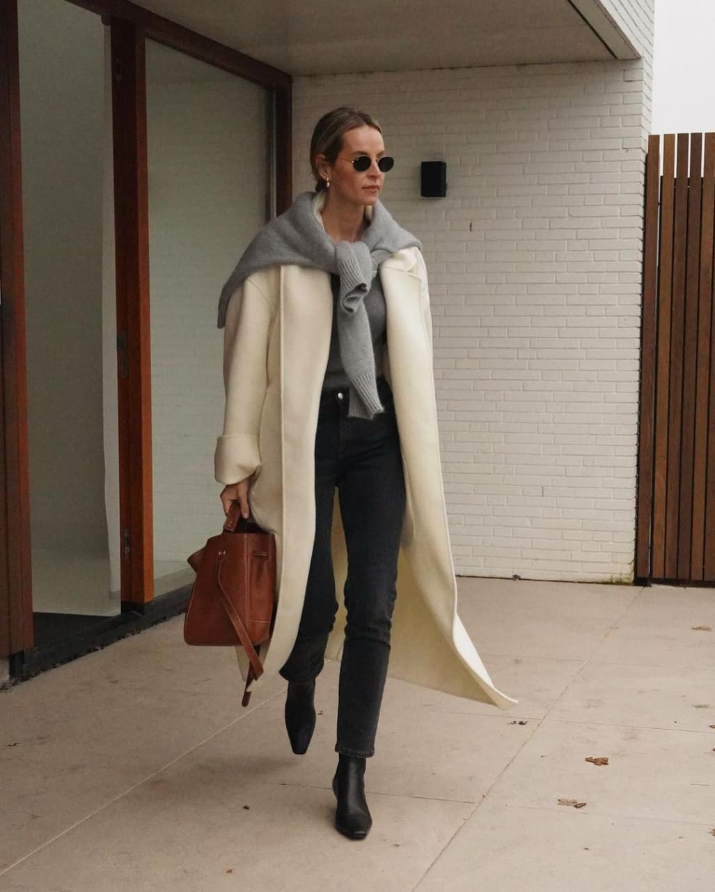 A white t-shirt is a timeless staple, but Anouk Yve takes it to the next level by layering it under an oversized knit sweater. This styling trick not only adds warmth but also introduces an effortless contrast in textures. The key is to let the hem of the t-shirt peek out from under the knit for a relaxed, nonchalant feel. Pair it with straight-leg jeans and pointed-toe boots for an outfit that feels casual yet put-together.