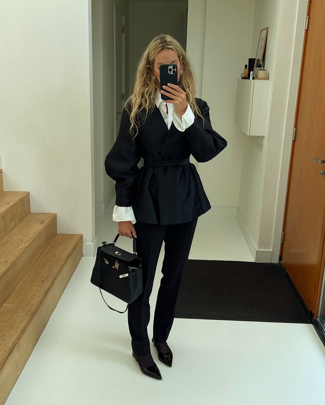 One of Anouk’s signature styling tricks is layering a knit sweater over her shoulders—a simple yet impactful way to add dimension to an outfit. Whether draped over a button-up shirt or paired with a silk blouse, this trick creates an effortless addition to our look. Opt for a soft, neutral-toned knit in cashmere or mohair to complement structured pieces like tailored trousers or a pencil skirt. The key is to keep the rest of the look sleek and polished, allowing the knit to serve as both an accessory and a practical layering piece.