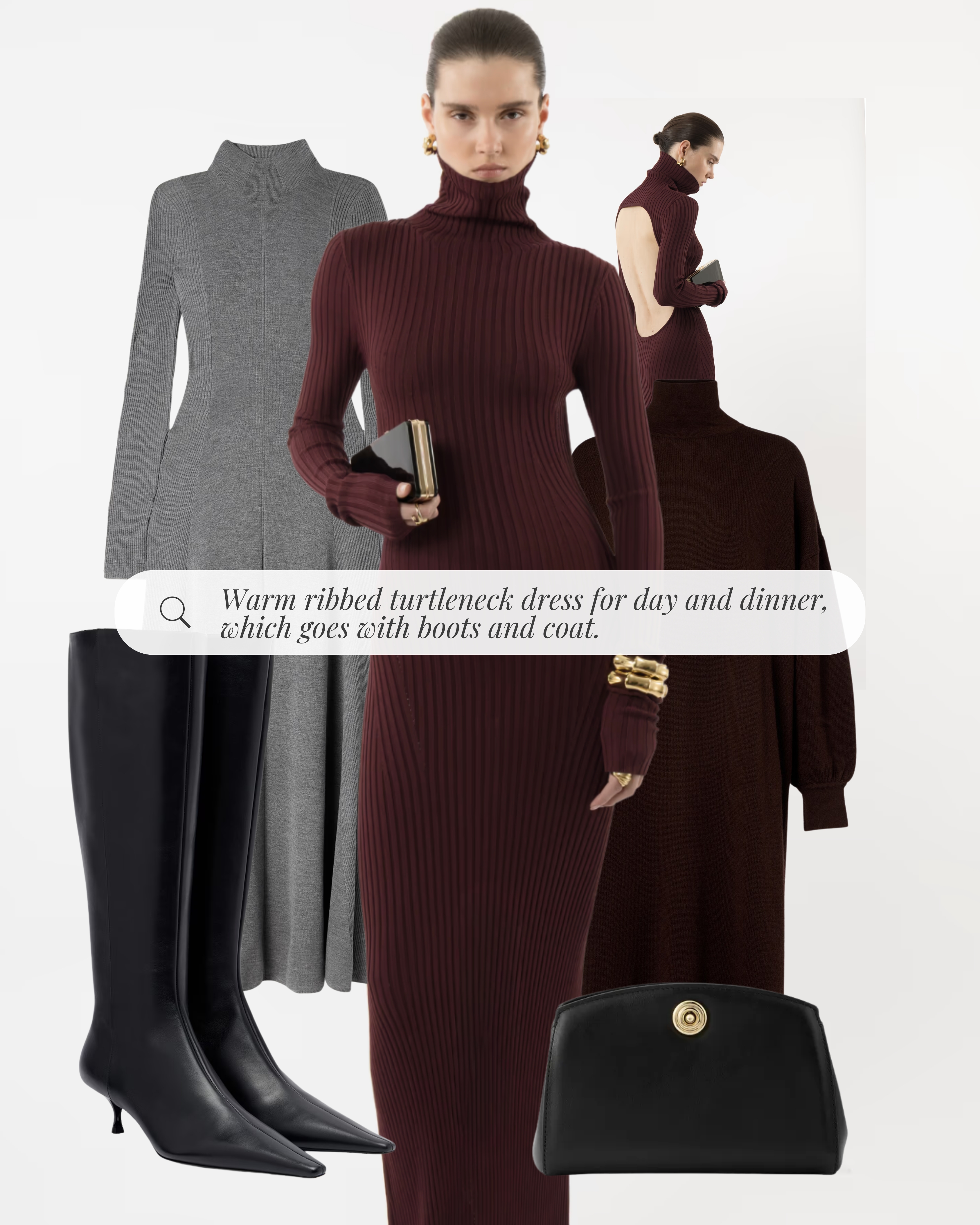 Prompt: "Warm ribbed turtleneck dress for day and dinner, which goes with boots and coat."