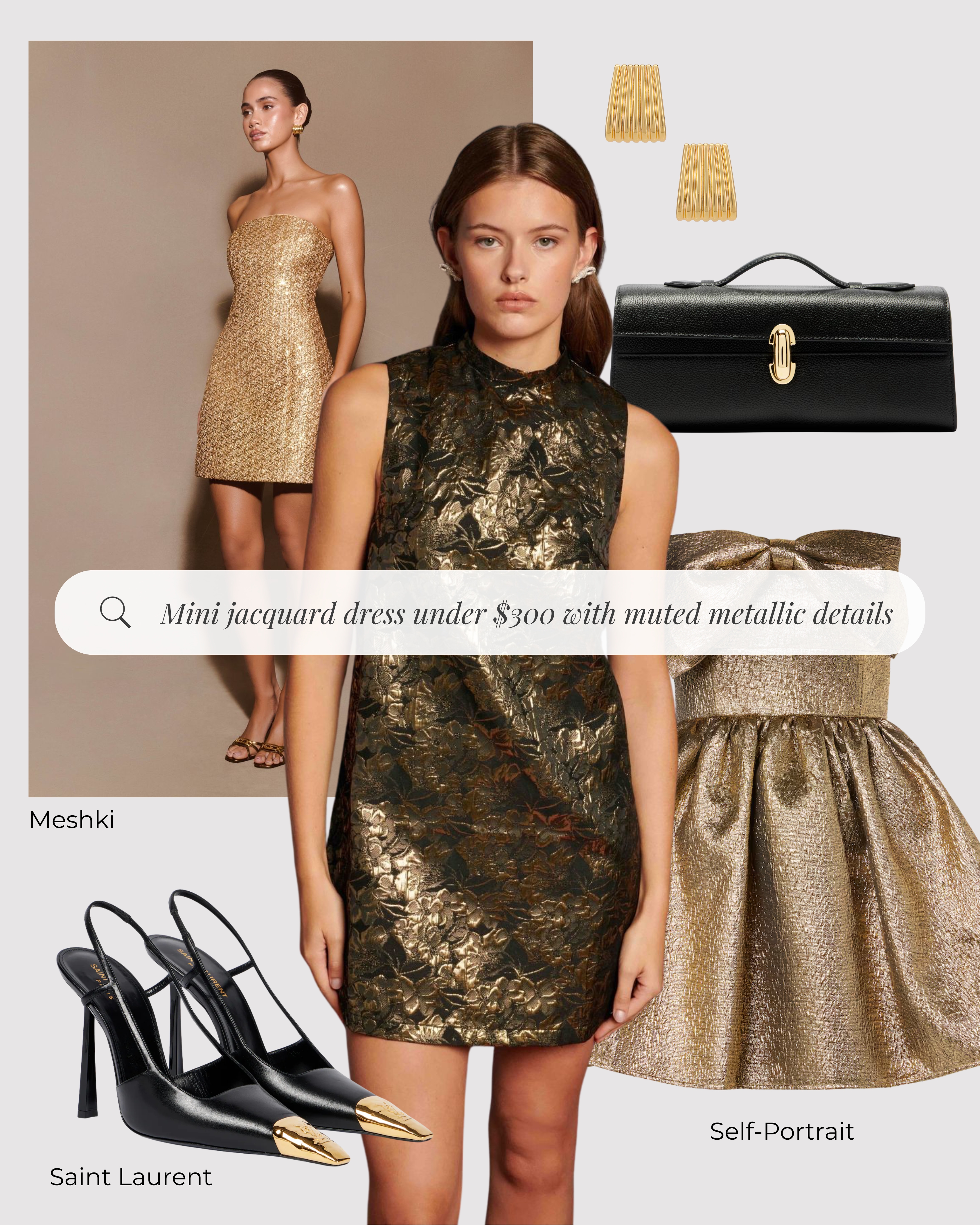 The Jacquard Statement Mini Jacquard brings texture and depth that instantly elevate a mini silhouette. Subtle metallic threads catch the light without overpowering the look, making it refined rather than flashy. It's a statement piece that feels intentional and sophisticated. Prompt: "Designer mini jacquard under $300 with muted metallic details."