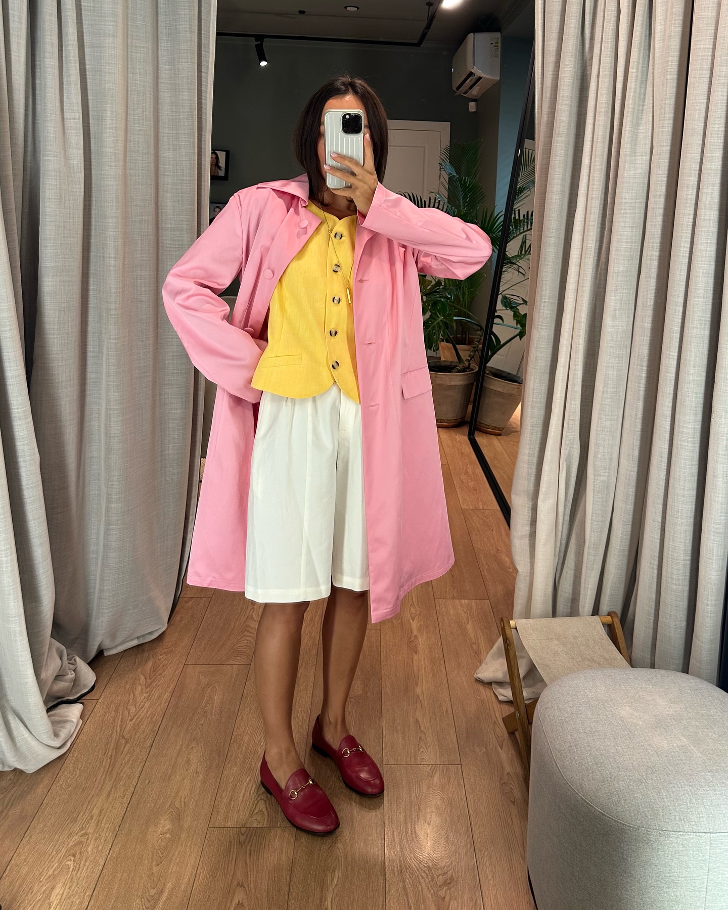 A lightweight trench in blush pink offers practical layering for unpredictable spring weather. The pastel color instantly freshens up your outerwear and adds a feminine touch to any look.