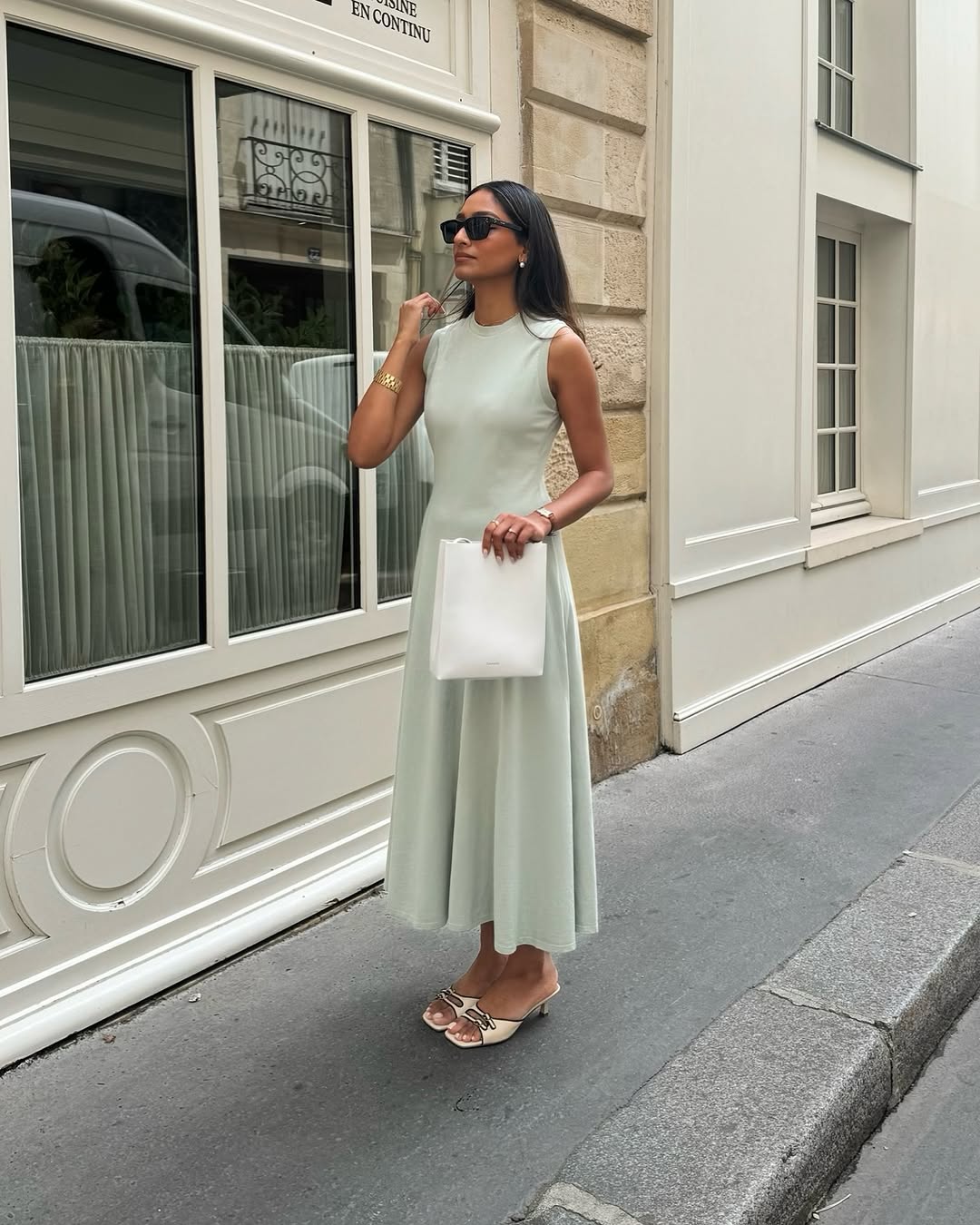 A flowy midi in mint green is breezy, joyful, and perfectly in line with spring’s pastel moment—wear it on sunny days or layer with a cardigan when it’s cooler.