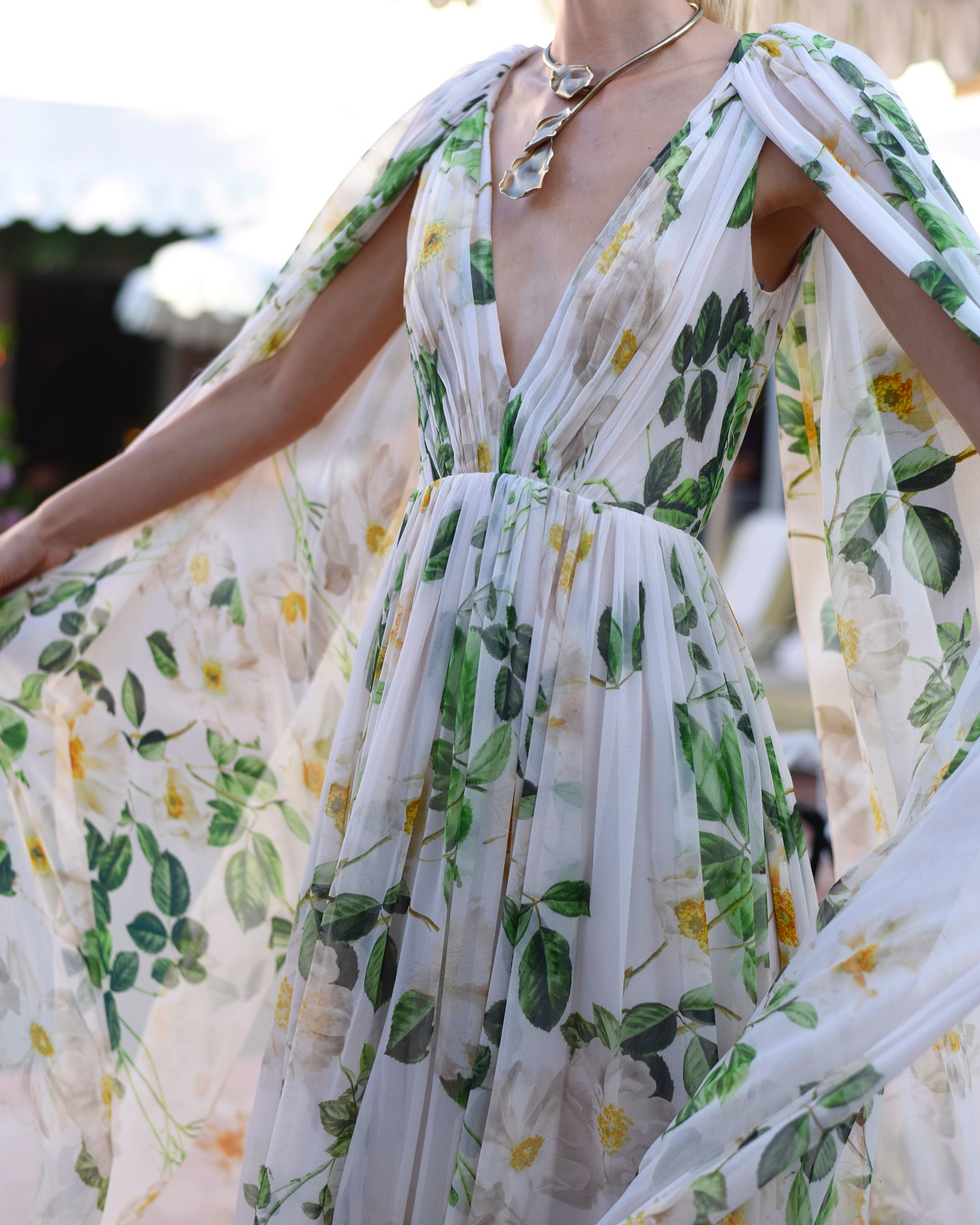 Cape-effect pleated floral-print chiffon gown