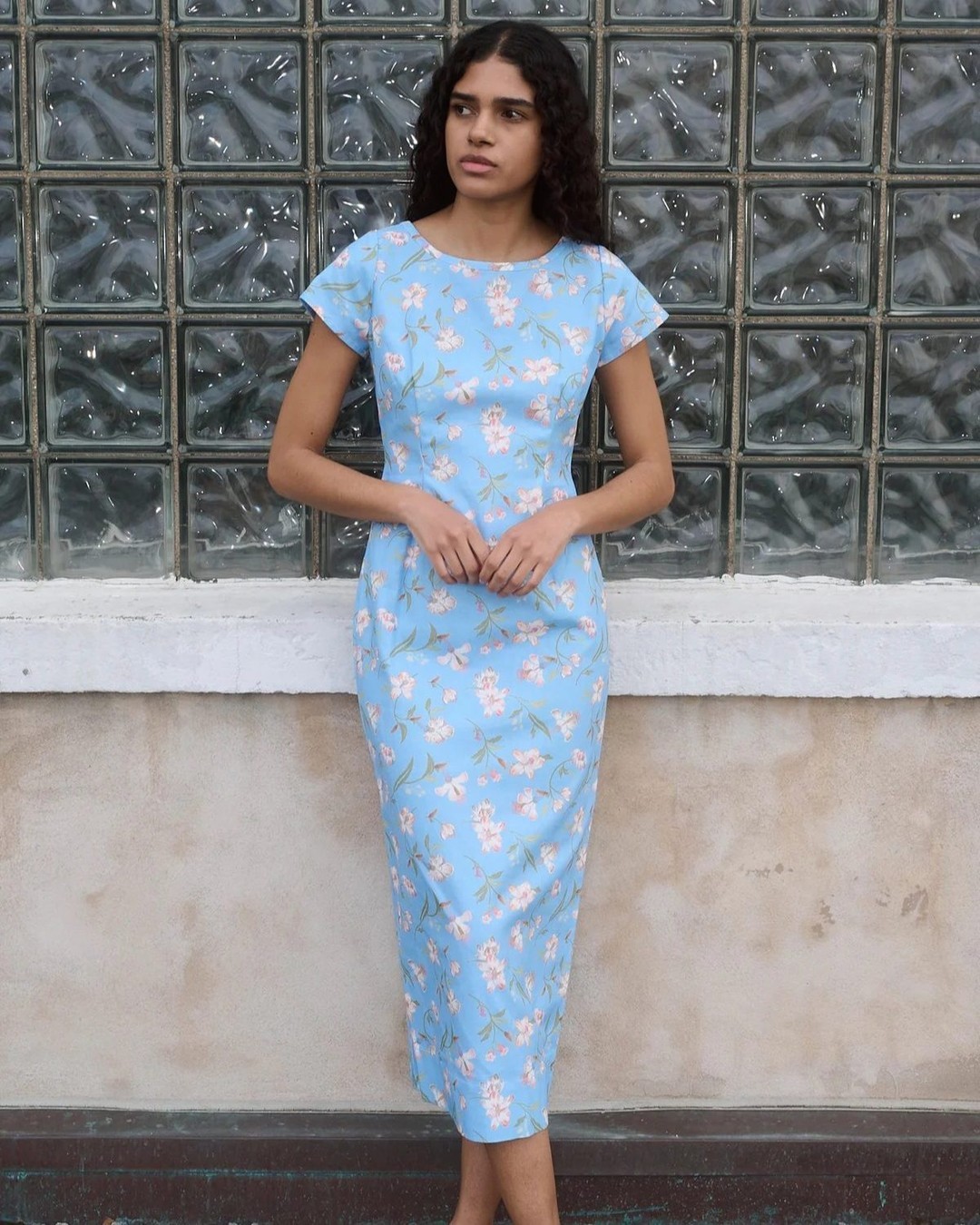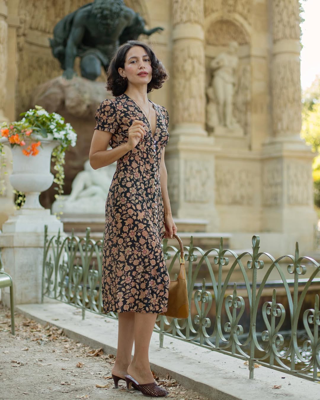 A vintage-inspired floral print—especially in muted or dusty tones—channels the soft romance of the 1930s and 40s. The midi length keeps the look appropriate for most wedding venues.